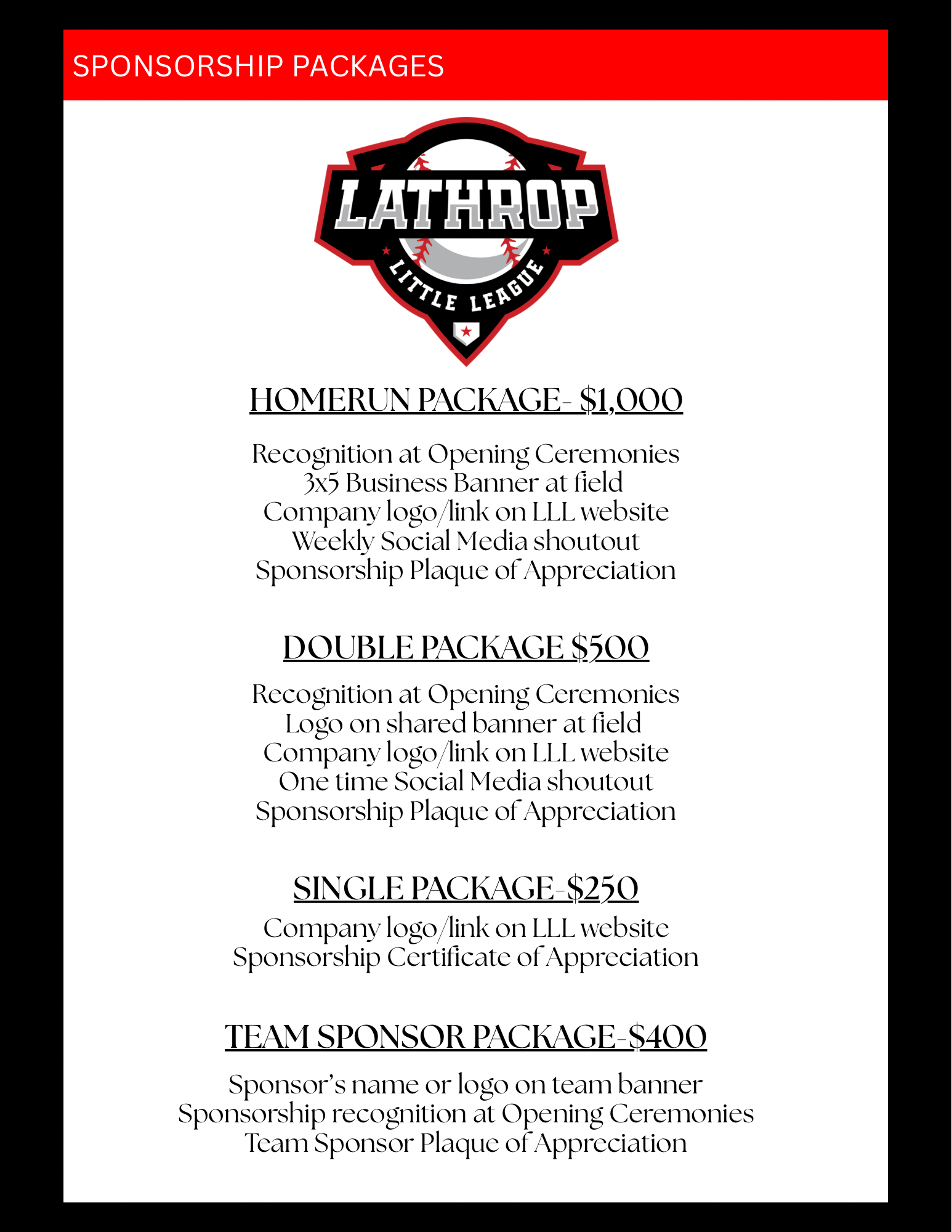 Becoming a sponsor is easy! Complete our sponsorship form above and join us in making the Spring 2026 season our best yet. Email CMuniz@lathroplittleleague.org if you would like more information